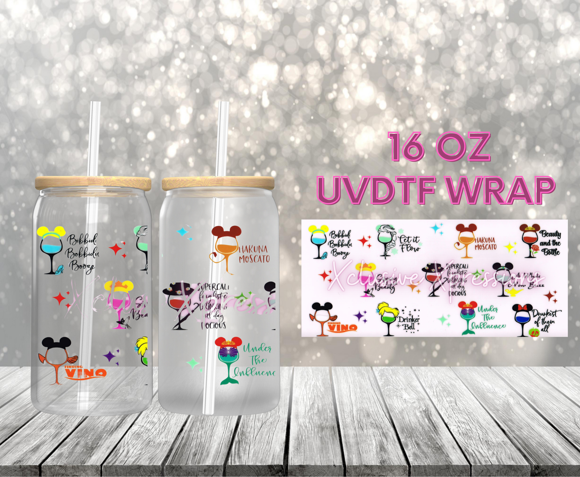 UVDTF cup wrap is sized to fit most 16oz glass cups. Wrap size is about 9.4” x 4.3”.