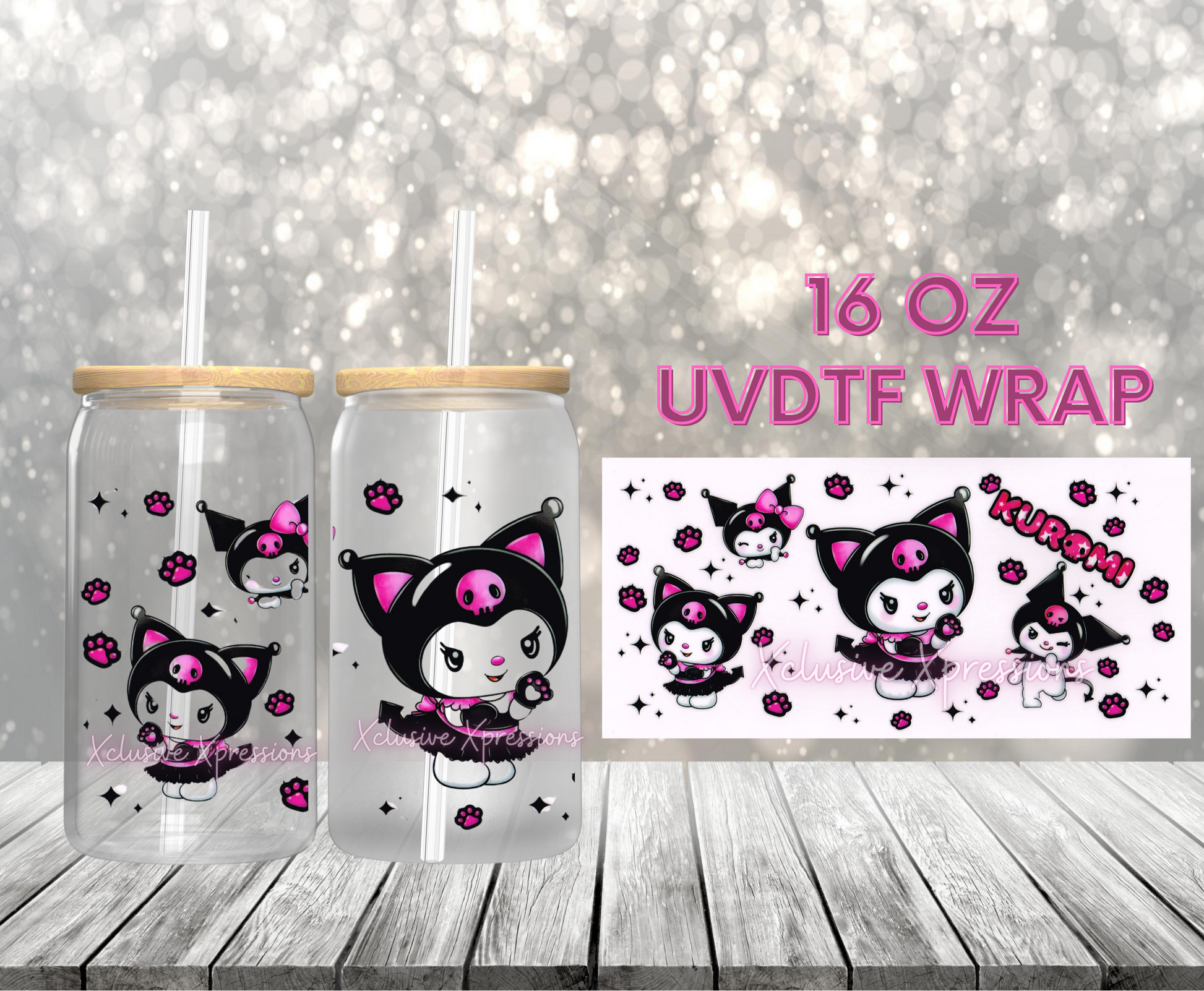 UVDTF cup wrap is sized to fit most 16oz glass cups. Wrap size is about 9.4” x 4.3”.