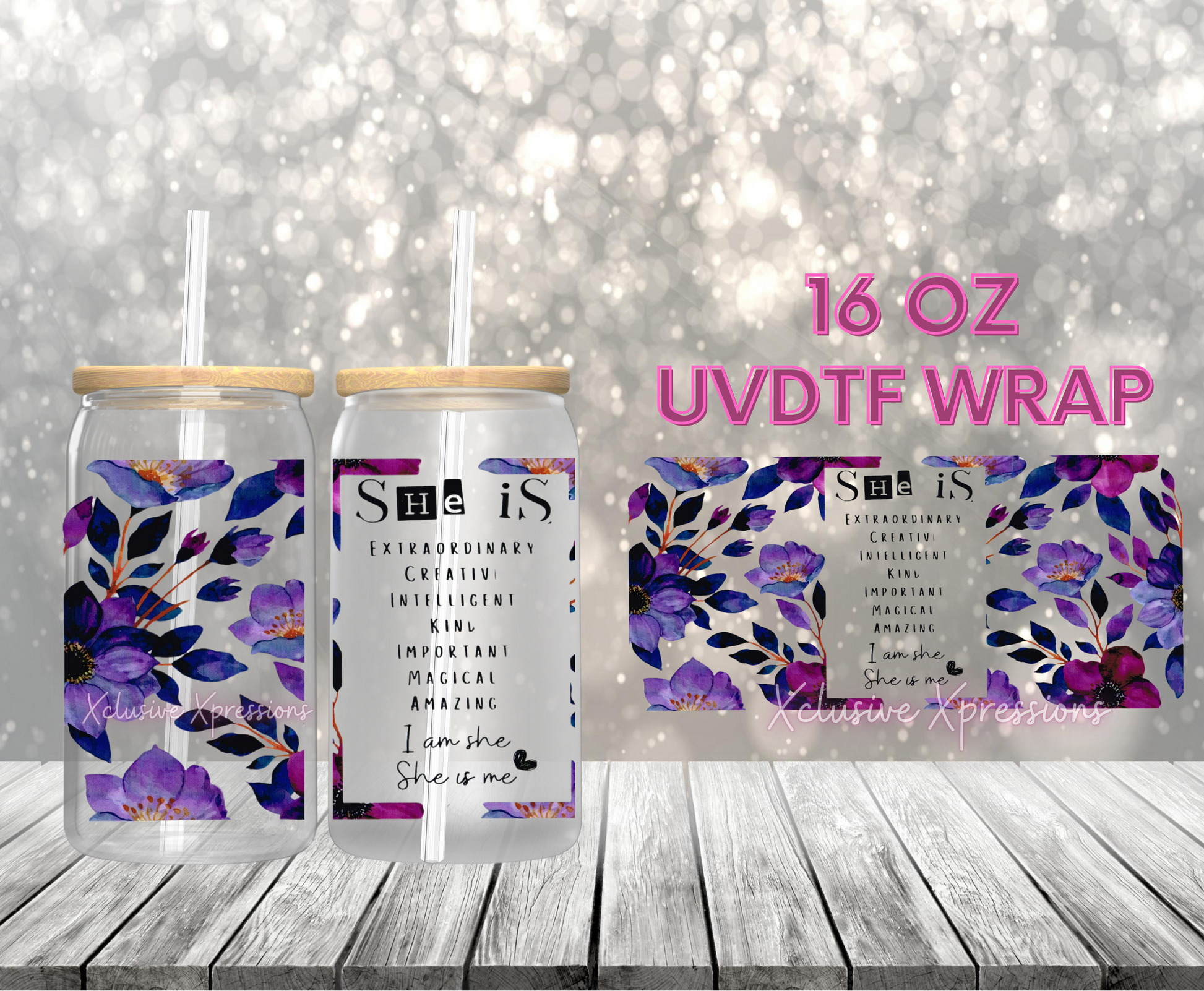 UVDTF cup wrap is sized to fit most 16oz glass cups. Wrap size is about 9.4” x 4.3”.