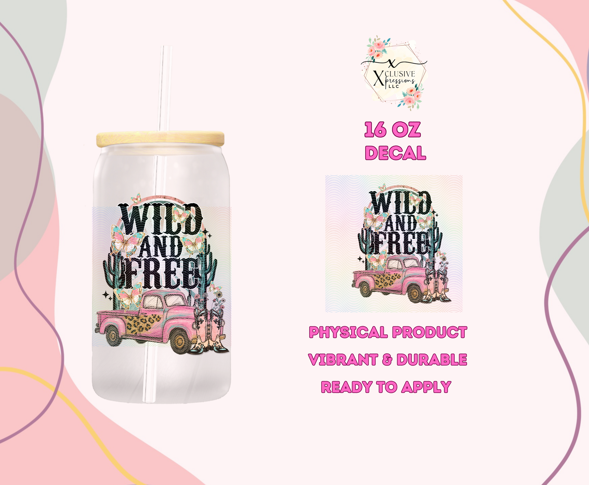 Cup wrap is sized to fit most 16oz glass cups. Wrap size is about 9.4” x 4.3”.