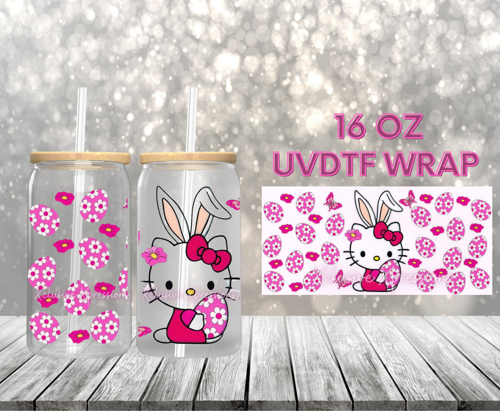 UVDTF cup wrap is sized to fit most 16oz glass cups. Wrap size is about 9.4” x 4.3”.