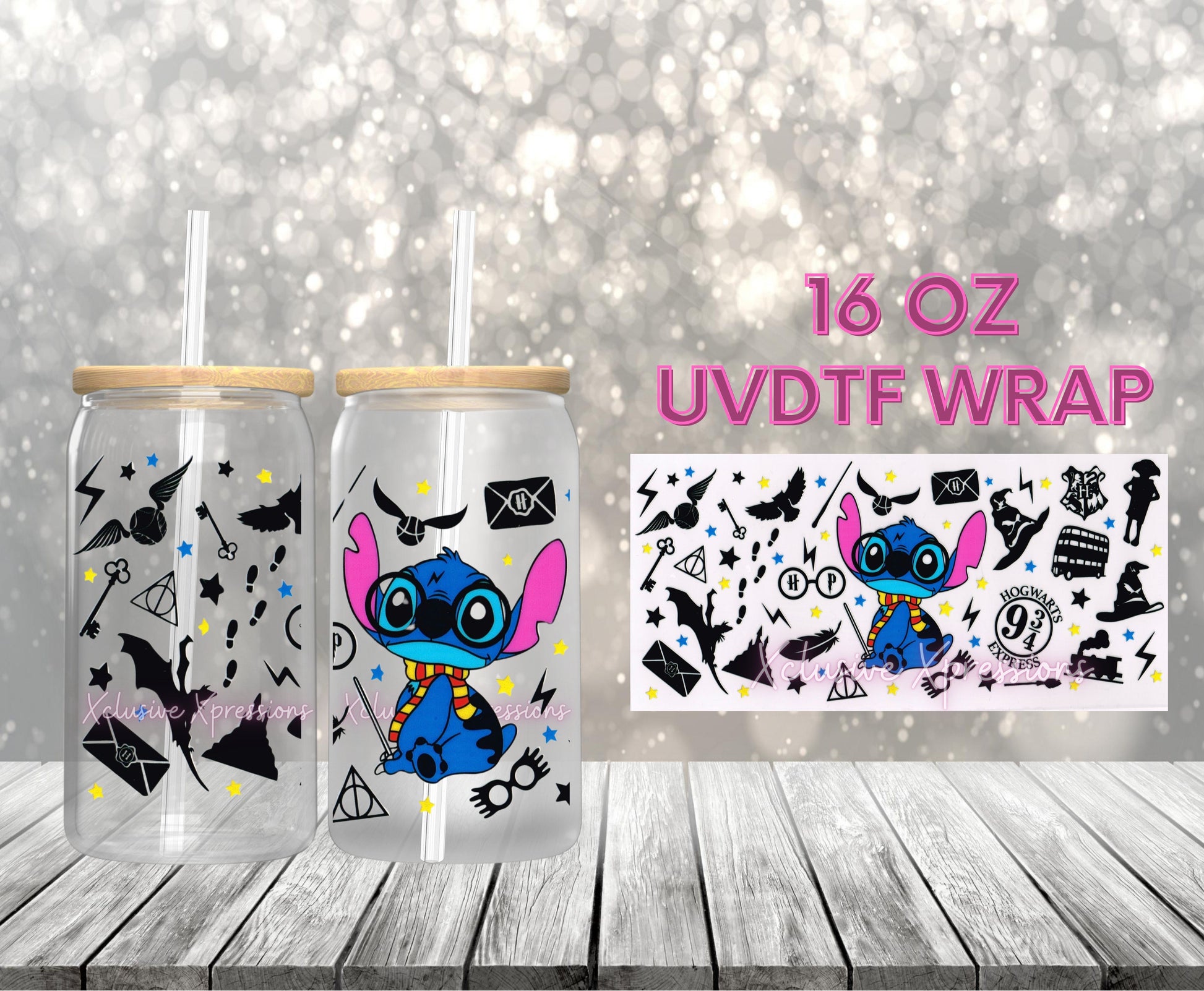 UVDTF cup wrap is sized to fit most 16oz glass cups. Wrap size is about 9.4” x 4.3”.