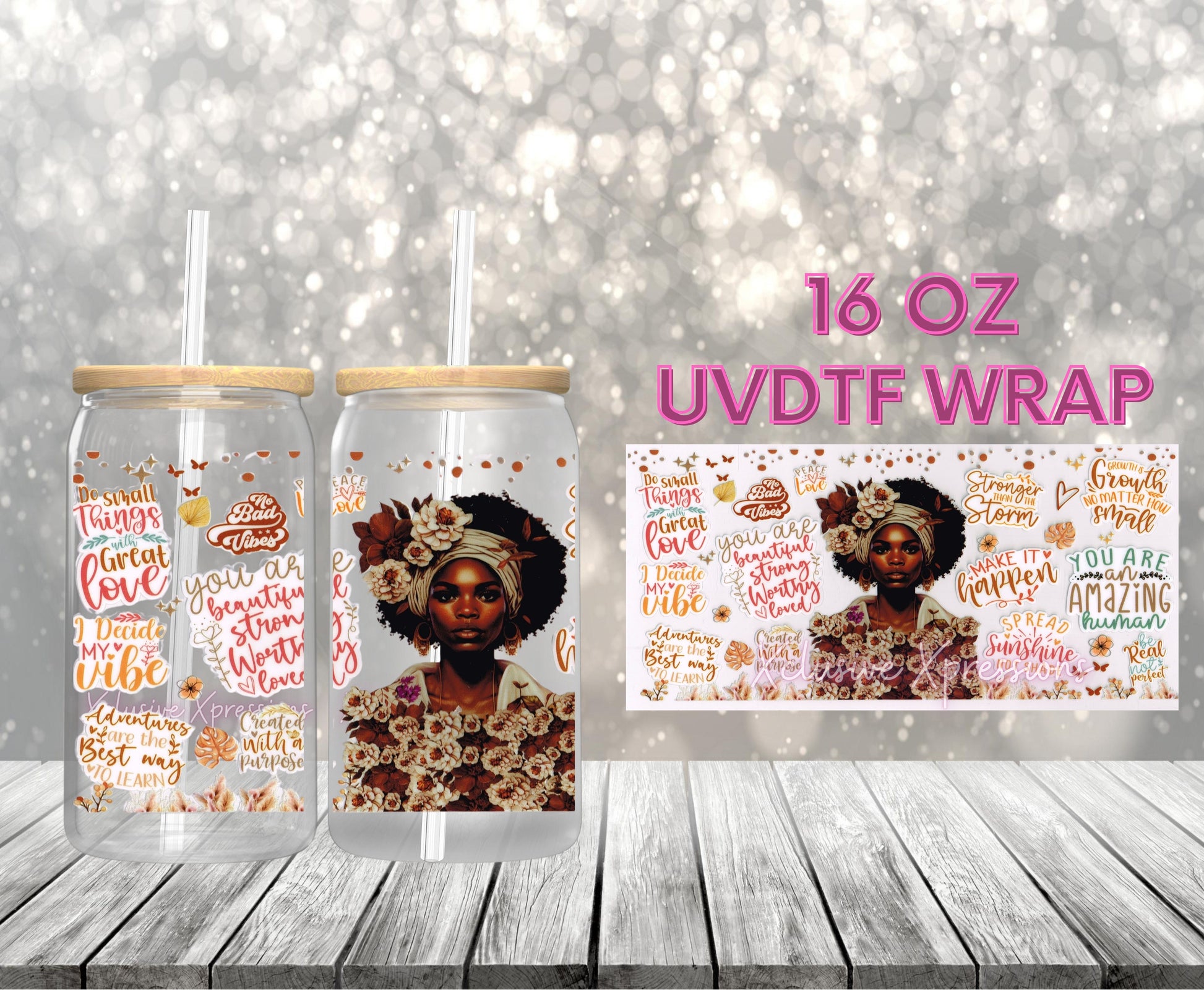 UVDTF cup wrap is sized to fit most 16oz glass cups. Wrap size is about 9.4” x 4.3”.