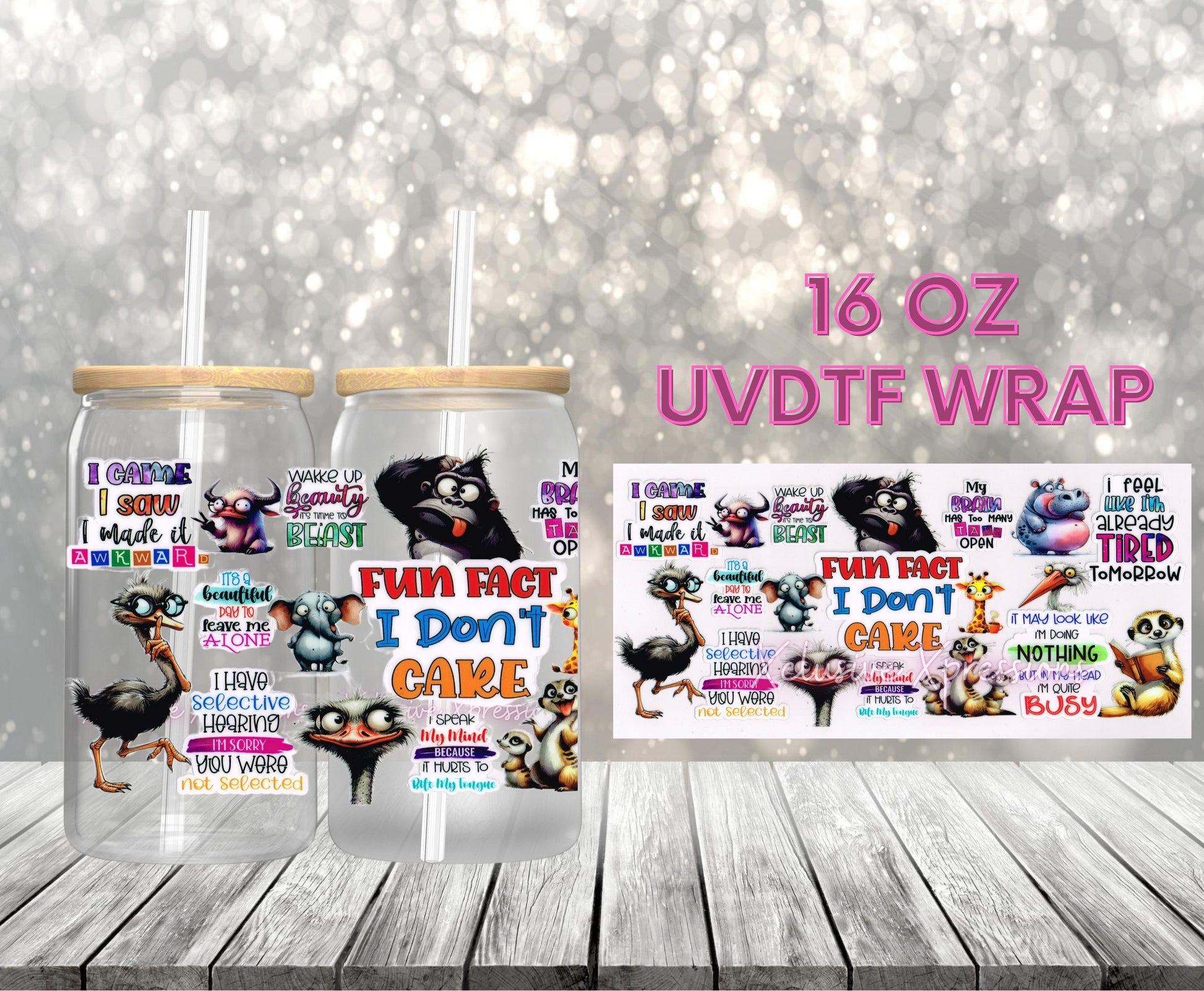 UVDTF cup wrap is sized to fit most 16oz glass cups. Wrap size is about 9.4” x 4.3”.
