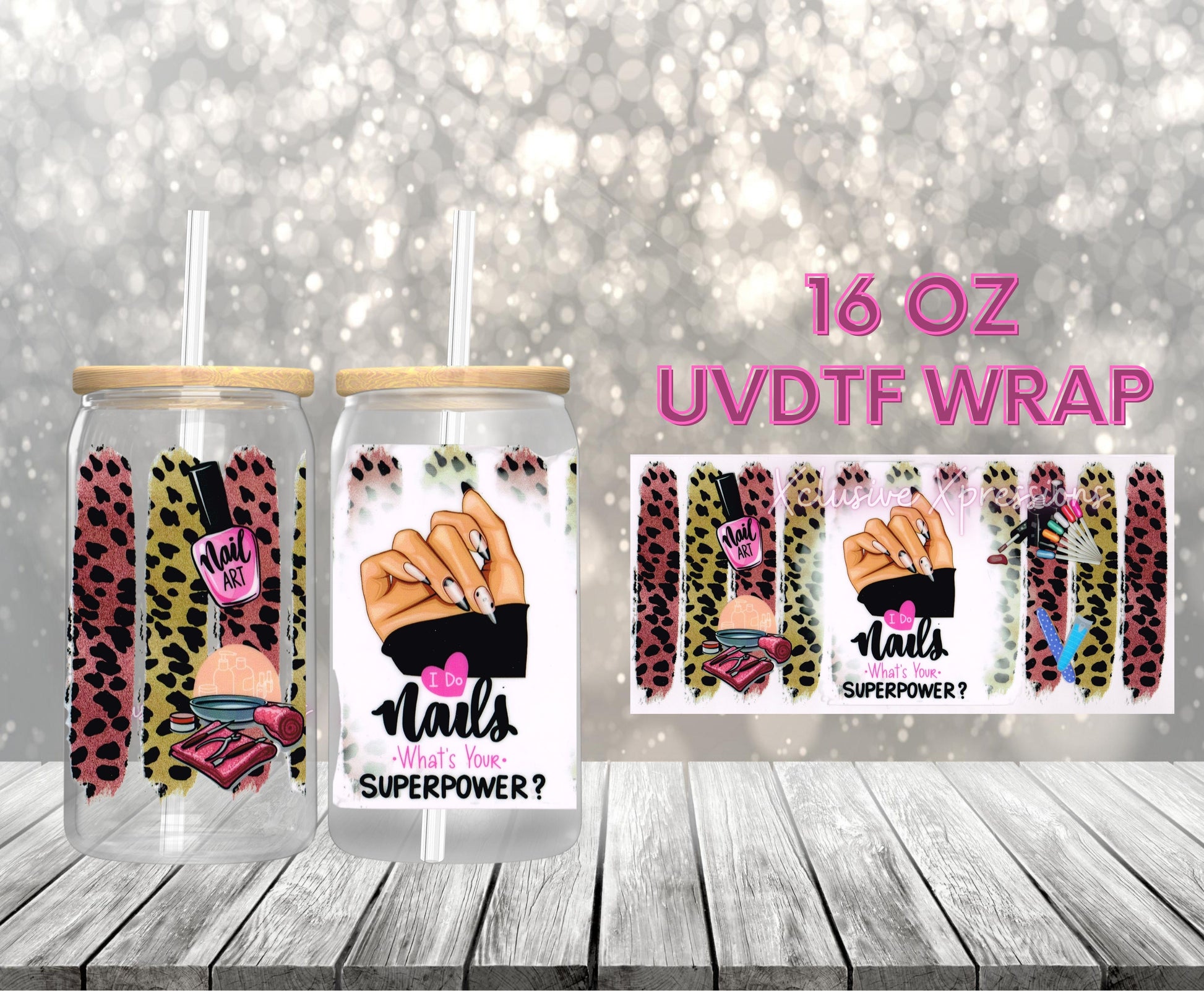 UVDTF cup wrap is sized to fit most 16oz glass cups. Wrap size is about 9.4” x 4.3”.