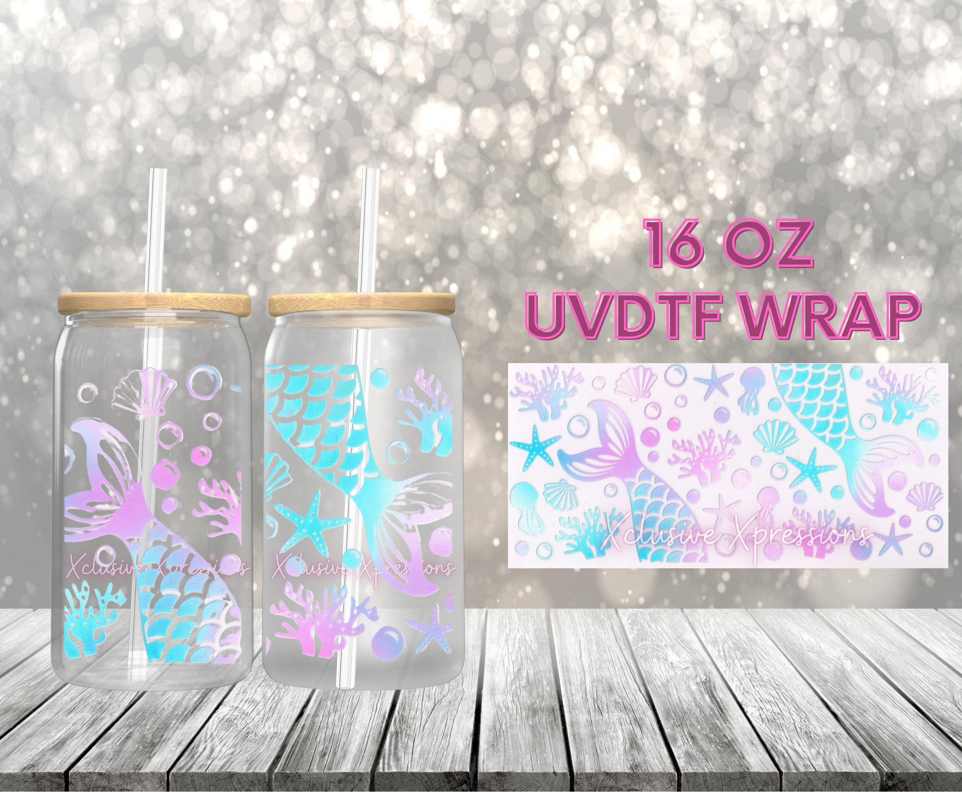 UVDTF cup wrap is sized to fit most 16oz glass cups. Wrap size is about 9.4” x 4.3”.