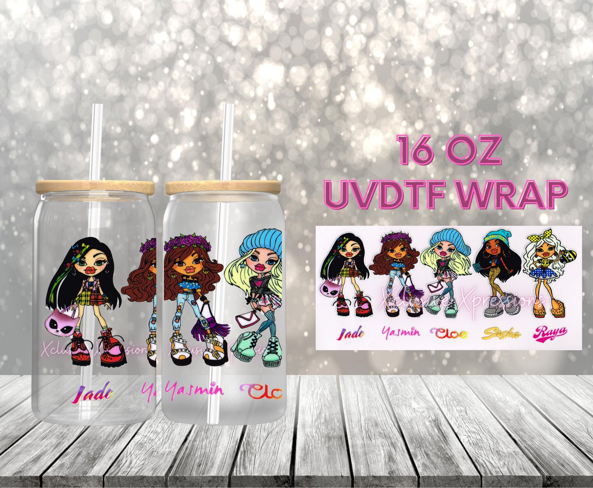 UVDTF cup wrap is sized to fit most 16oz glass cups. Wrap size is about 9.4” x 4.3”.