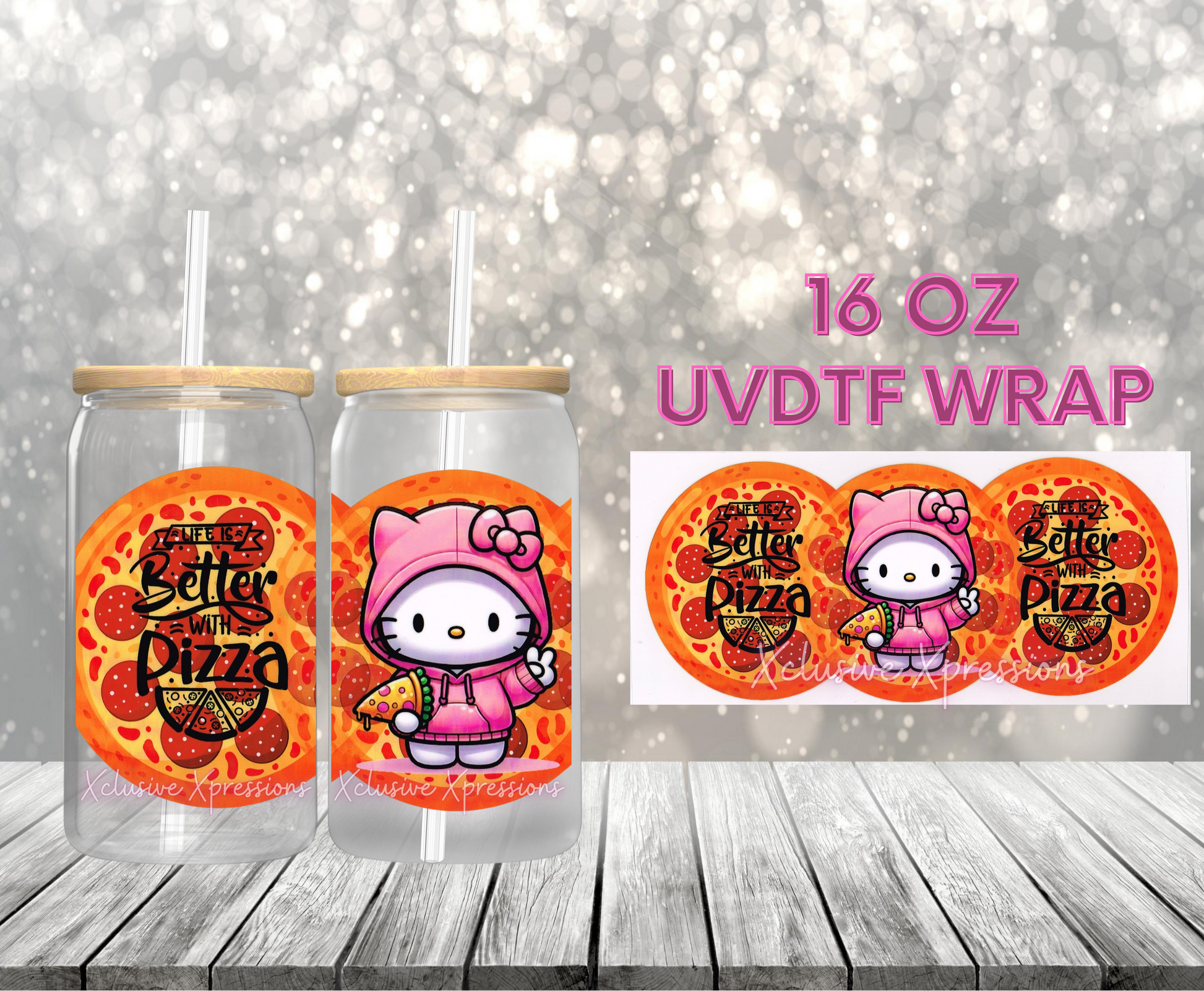 UVDTF cup wrap is sized to fit most 16oz glass cups. Wrap size is about 9.4” x 4.3”.