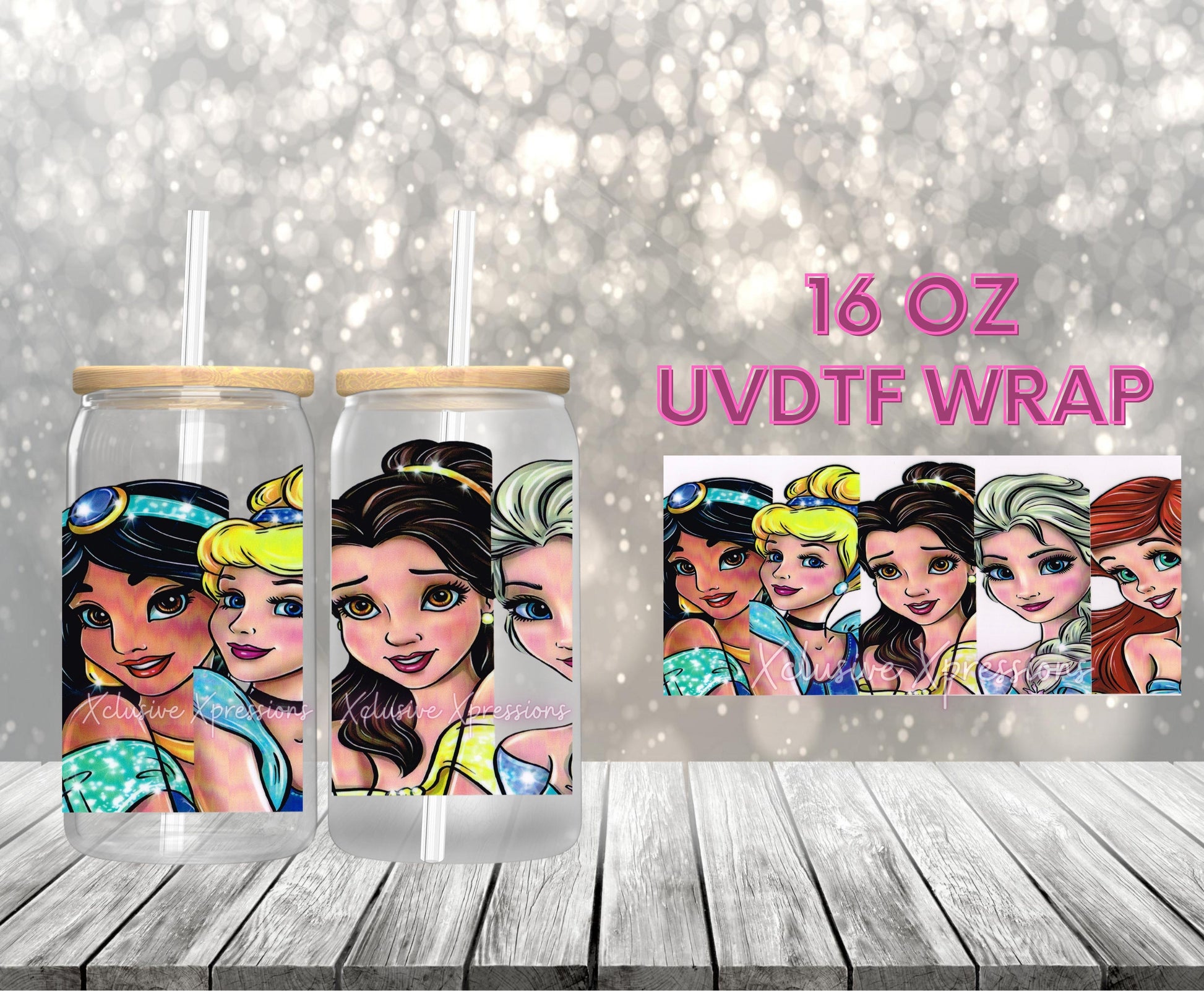 UVDTF cup wrap is sized to fit most 16oz glass cups. Wrap size is about 9.4” x 4.3”.
