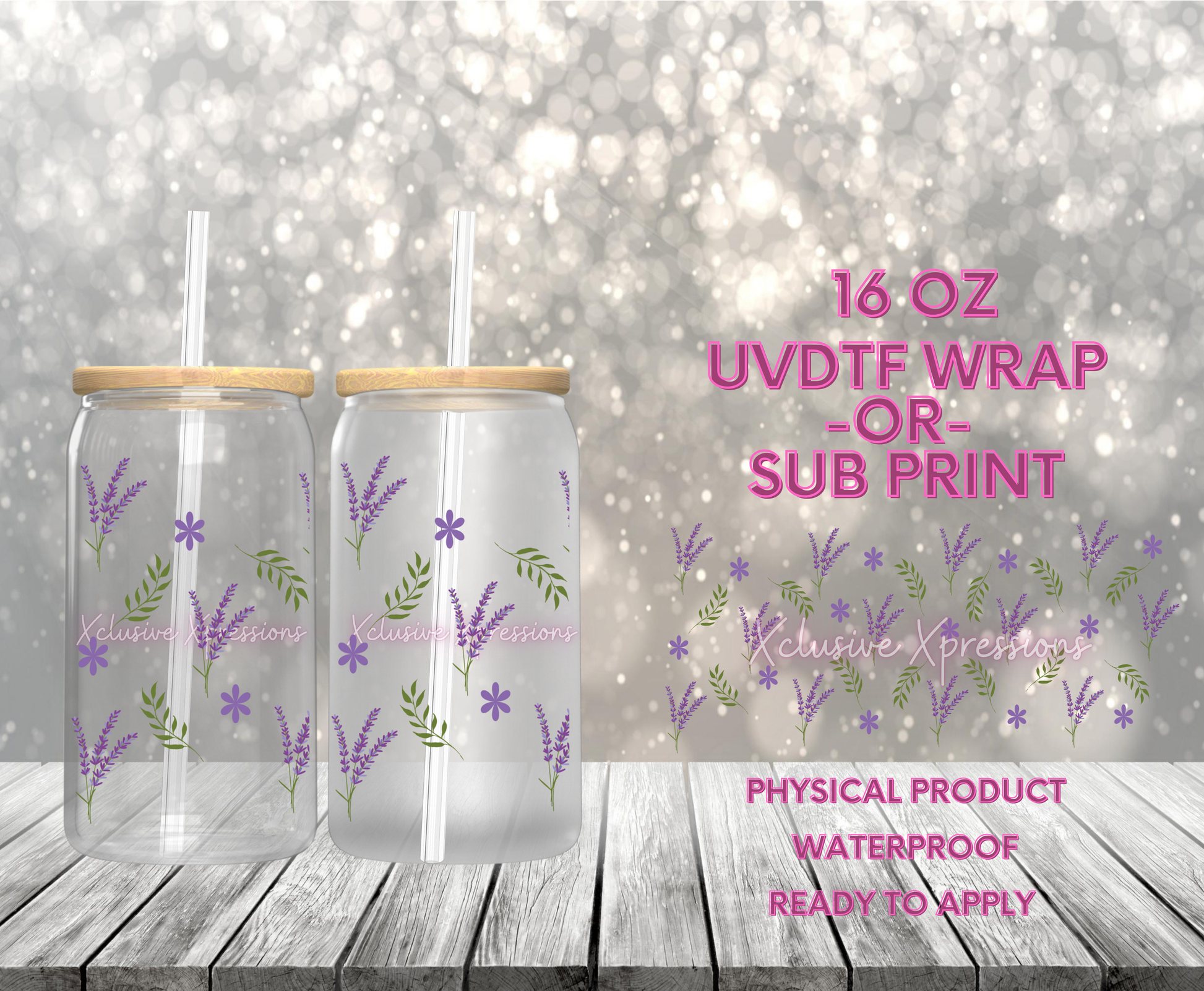 UVDTF cup wrap is sized to fit most 16oz glass cups. Wrap size is about 9.4” x 4.3”.