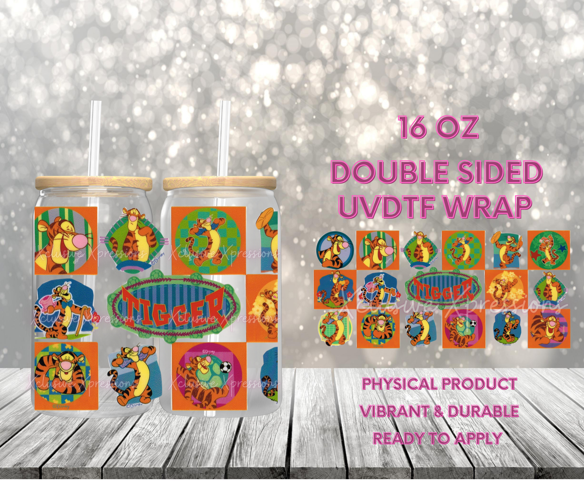 UVDTF cup wrap is sized to fit most 16oz glass cups. Wrap size is about 9.4” x 4.3”.