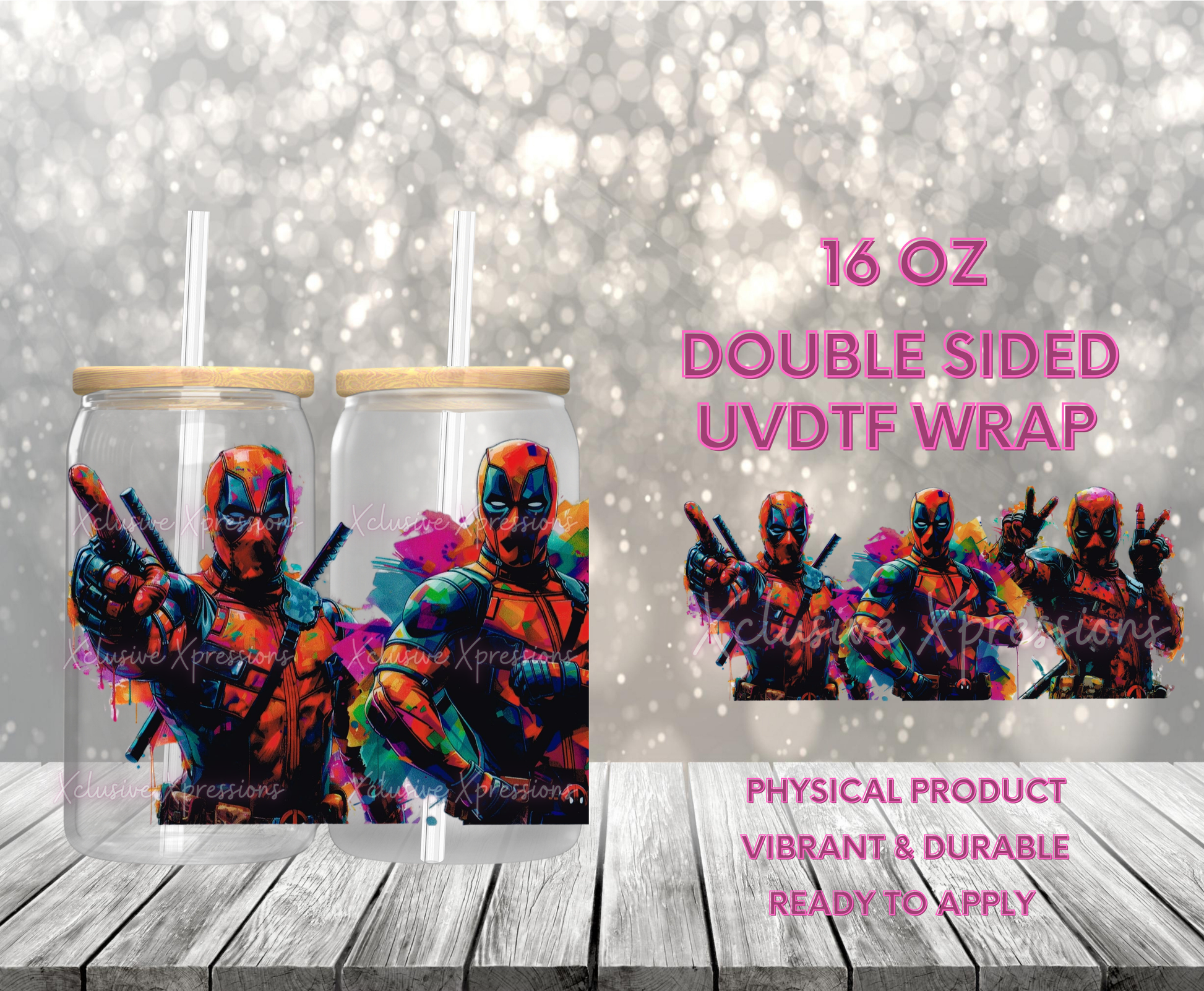 UVDTF cup wrap is sized to fit most 16oz glass cups. Wrap size is about 9.4” x 4.3”.